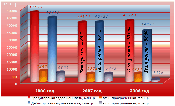 Предприятие испытывает дефицит оборотных средств. Большая доля оборотных средств УП «Карлиновгаз» сформирована из заемных источников, а собственных средств не хватает даже на покрытие необоротных активов. О чем свидетельствуют отрицательное значение коэффициента обеспеченности собственными оборотными средствами на 01.01.2007 г., где коэффициент имел значение минус 0,01. Несмотря на то, что значение показателя ниже нормативного, наблюдается положительная тенденция его изменения: на 1.01.2008 г. коэффициент равен 0,20; на 1.01.2009 г. – 0,23 Эта тенденция роста коэффициента обеспеченности собственными оборотными средствами в 2006-2008 гг. обуславливается превышением темпов роста собственного капитала предприятия над темпами роста необоротных и оборотных активов: - в 2007г. к 2006г. темп роста: собственного капитала – 115 %; необоротных средств – 110,4 %; оборотных активов - 101 %; - в 2008г. к 2007г. темп роста: собственного капитала – 103,5 %; необоротных средств – 103,2 %; оборотных активов - 0,96 %. Нехватка оборотных средств, для дальнейшего наращивания объемов производства, своевременной выплаты заработной платы, осуществления налоговых платежей в бюджет и внебюджетные фонды, оплаты потребленных энергоносителей, расчета по ранее полученным кредитам вынуждает предприятие обращаться за кредитными ресурсами к банкам. Банки выделяют, как правило, лишь короткие кредитные ресурсы и под высокий процент, возвратить которые необходимо до того, как предприятие может получить экономический эффект от полученного кредита. Несмотря на вышесказанное, УП «Карлиновгаз» пользуется репутацией платежеспособного заемщика. Благодаря активной работе, проводимой руководством предприятия с финансовыми институтами, предприятию удается улучшать условия кредитования. Кредиторская задолженность УП «Карлиновгаз»: - в 2007г. к 2006г.: составила 85 % - уменьшилась на 7041 млн. р., в т.ч. просроченная задолженность: 74 % - уменьшение на 1965 млн. р.; - в 2008г. к 2007г.: составила 103 % - увеличилась на 1171 млн. р., в т.ч. просроченная задолженность: 101 % - увеличилась на 55 млн. р. В структуре кредиторской задолженности просроченная задолженность занимает удельный вес - 15,7 %, 13,6 %, 13,4 % в 2006, 2007 и 2008 годах соответственно. Дебиторская задолженность УП «Карлиновгаз»: - в 2007 г. к 2006г.: составила 93 % - уменьшилась на 3227 млн. р., в т.ч. просроченная: 86 % - уменьшилась на 923 млн. р.; - в 2008 г. к 2007г.: составила 96 % - уменьшилась на 5799 млн. р., в т.ч. просроченная: 86 % - уменьшилась на 3947 млн. р. В структуре кредиторской задолженности просроченная задолженность занимает удельный вес - 14,6 %, 13,4 %, 4,4 % в 2006, 2007 и 2008 годах соответственно. Динамика изменения дебиторской и динамика изменения кредиторской задолженности в анализируемом периоде наглядно представлены на рисунке 14. Превышение темпов роста дебиторской задолженности над кредиторской в 2007 г. говорит о перетекании абсолютно ликвидных оборотных средств на расчетных счетах в дебиторскую задолженность, что, фактически, свидетельствует о временном извлечении из текущего хозяйственного оборота значительной доли оборотных средств и предоставлении предприятиям-должникам беспроцентного коммерческого кредита. Однако данная ситуация не является критичной для предприятия. В целях снижения дебиторской задолженности в 2008 г. на предприятии были разработаны и применены эффективные мероприятия по сниже