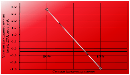 Определим внутреннюю норму доходности, построив график при значениях чистого дисконтированного дохода в пятом году ДД5=(+3,027) млн. р. при Е1=0,1 и ДД5=(-1,230) млн. р. при Е2=0,13 (год, в котором чистый дисконтированный доход имеет положительное и отрицательное значения).