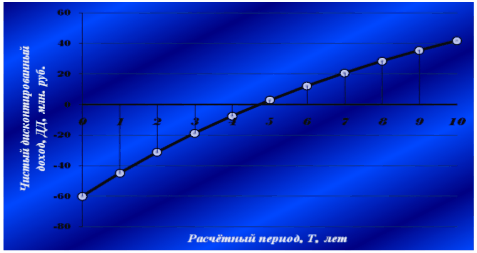 Рисунок 19 – Определение внутренней нормы доходности Внутренняя норма доходности определяется в точке, соответствующей нулевому значению ЧДД и равна 0,124 (см. таблицу 26 и рисунок 19). Динамический срок окупаемости (Тд), или срок возмещения затрат, определим графическим методом (рисунок 20). Точка пересечения кривой с осью X определяет динамический срок окупаемости, который, согласно рисунку 20, равен 4,8 лет, что соответствует устанавливаемой величине нормативного показателя. Фактический период времени, в течение которого инвестиционные вложения покрываются суммарными доходами от внедрения мероприятия, т.е. фактический срок возможного возврата кредита или других заемных инвестиций, составит пять лет.