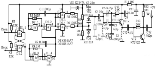 Рисунок 23 – Принципиальная схема работы бортового контроллера В активном режиме («Пуск») сигнал передатчика модулируется по частоте прерывающимся сигналом звуковой частоты. При приеме этого сигнала из динамика приемника раздается прерывающийся тональный звук. Функционально, схема состоит из высокочастотного генератора с усилителем мощности (передатчика) и логической схемы управления модуляцией. Задающий генератор выполнен на VT1. Частота генерации зависит от настройки контура на катушке L1. Варикапы VD2 и VD3 входят в состав этого контура и служат для осуществления частотной модуляции. Когда нет модуляции, на них поступает некоторое среднее постоянное напряжение, примерно, равное половине напряжения стабилизации стабилизатора на VD1. При этом, излучается сигнал средней (несущей) частоты. Во время модуляции напряжение на варикапах меняется вниз и вверх относительного этой точки, соответственно изменяется и частота генерации задающего генератора. Каскад на транзисторе VT2 усиливает сигнал по мощности и устраняет влияние емкости антенны на настройку контура задающего генератора Нагрузка каскада - резистивная. Рабочая точка задана базовым резистором R13. Связь между каскадами емкостная - через С10. Катушка L1 бескаркасная «пружинка» из медного луженного намоточного провода диаметром около 0,6 мм (обычный намоточный провод предварительно зачищают от лаковой изоляции и облуживают). Индуктивность на схеме обозначена условно. Катушка состоит из десяти витков. Внутренний диаметр намотки около 4 мм (предварительно, катушка намотана на винте М4, затем винт из нее вывинчен). Настраивая передатчик на выбранную частоту в диапазоне, индуктивность катушки изменяют, растягивая или сдвигая витки. При необходимости число витков легко уменьшить, сдвинув и спаяв вместе витки, оказавшиеся ненужными. Дроссель L2 - фабричный типа ДМ-01 или любой другой высокочастотный, индуктивностью 200-500 мкГн. Подстроенный конденсатор С5 керамический. Тональный сигнал генерирует мультивибратор на элементах D2.1 и D2.2 Буферные каскады на элементах D2.3 и D2.4 служат для установки среднего постоянного напряжения на варикапах во время блокировки этого мультивибратора. Блокируется мультивибратор логическим нулем на выводах 6 и 9 D2. При этом, элемент D2.4 фиксируется в положении с единицей на выходе, а единица с выхода элемента D2.2 инвертируется элементом D2.3. В результате, когда мультивибратор заблокирован, R5 подтянут к нулю, a R6 - к единице. А в их общей точке будет среднее напряжение. Когда мультивибратор работает, элементы D2.3 и D2.4 функционируют параллельно, изменяя напряжение на варикапах то в одну, то в другую сторону относительно средней точки. Прерывает тональные посылки инфразвуковой мультивибратор на элементах D1.3 и D1.4. Напряжение выхода элемента D1.4 управляет работой тонального генератора. Инфразвуковым генератором управляет RS-триггер на элементах D1.1 и D1.2. Чтобы перевести сигнализатор в ждущий режим (немодулированное излучение) нужно подать логический ноль или отрицательный импульс на вход «Стоп», а для активного режима (включение модуляции) ноль (или отрицательный импульс) нужно подать на вход «Пуск». Налаживание следует начать с поиска пустого участка на УКВ диапазоне. Затем, подстройкой L1 и С5 вывести передатчик на устойчивую генерацию на этой частоте. Тон звук