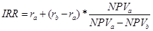 В отличие от чистого приведенного эффекта индекс рентабельности является относительным показателем: он характеризует уровень доходов на единицу затрат, т.е. эффективность вложений - чем больше значение этого показателя, тем выше отдача каждого рубля, инвестированного в данный проект. Благодаря этому критерий PI очень удобен при выборе одного проекта из ряда альтернативных, имеющих примерно одинаковые значения NPV (в частности, если два проекта имеют одинаковые значения NPV, но разные объемы требуемых инвестиций, то очевидно, что выгоднее тот из них, который обеспечивает большую эффективность вложений), либо при комплектовании портфеля инвестиций с целью максимизации суммарного значения NPV. Внутренняя норма доходности (IRR) - это такое значение показателя дисконта, при котором современное значение инвестиции равно современному значению потоков денежных средств за счет инвестиций, или значение показателя дисконта, при котором обеспечивается нулевое значение чистого настоящего значения инвестиционных вложений. Он характеризует порог безубыточности данных инвестиций. Для нахождения IRR находят различные значения дисконтированной ставки (r), при которой величина NPV меняется с плюса на минус. Далее находят IRR по формуле: