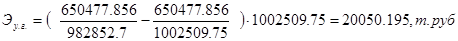 = Необходимо определить условно- годовую экономию. 1 при уменьшении удельных норм расхода Эу.р .=(Ц*Нрасх1 -Ц*Нрасх2 )*ВП, т.р. (47) Где Нрасх1 и Нрасх2 – удельные нормы расхода сырья, рассчитанные в проекте и принятые за год в натуральных единицах измерения. Ц – цена сырья, руб Эу.р.=(975*1,82-975*1,802)* 982852,70 =17199,92 т.р. где Усл -пост.- сумма условно- постоянных расходов в себестоимости продукции, 30% от полной себестоимости продукции, т. руб. ВП1 и ВП2 - объем выпуска продукции, рассчитываемого в проекте и принимаемой за базу сравнения, м3 . З/П – размер средней заработной платы рабочих по цеху Ч – численность высвобожденных рабочих “Таблица 13 - Технико-экономические показатели лесопильного производства”