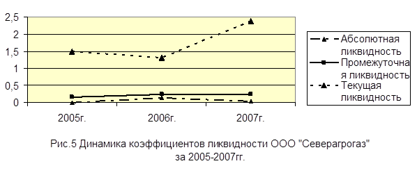 Из данных приложения 10 мы видим следующее: 1. Уменьшение суммы наиболее ликвидных активов (А1), за 2007 год они уменьшились на 1249 тыс.руб. (28,7%), при снижении суммы наиболее срочных обязательств (П1) на 49339тыс.руб. (71,3%). 2. Снижение доли быстрореализуемых активов (А2) на 8941 тыс.руб. (42,9%) в 2007 г. при росте суммы краткосрочных пассивов (П2) на 6000 тыс. руб. (17,6%). 3. Увеличение доли медленно реализуемых активов (А3) на 16690 тыс.руб. (15,1%) за 2007 год при росте долгосрочных пассивов на 46041 тыс.руб. (1365,0%). 4. Уменьшение суммы труднореализуемых активов на 15098 тыс.руб. (6,3%) при снижении суммы постоянных пассивов на 11300 тыс.руб. (4,2%). Баланс организации характеризуется излишками: 1) собственного капитала в сравнении с внеоборотными активами (излишек весьма условен, поскольку основные средства организации, вероятно, недооценены); 2) запасов в сравнении с долгосрочными обязательствами (причина излишка – отсутствие долгосрочных обязательств в течение почти всего анализируемого периода при значительной и возрастающей стоимости запасов); 3) дебиторской задолженности в сравнении с краткосрочными кредитами и займами в 2005г. Организация имеет два вида дефицита. Один из них связан с превышением краткосрочных кредитов и займов над дебиторской задолженностью. Динамика дефицита негативна: за анализируемый период он возрос с 13 млн. в 2006г. до 28 млн. в 2007г. Другой связан с чрезмерной кредиторской задолженностью и с её несбалансированностью с денежными средствами и другими высоколиквидными активами. Динамика дефицита положительная: за анализируемый период он уменьшился с 87 млн. в 2005г. до 17 млн. в 2007г. При этом следует отметить, что множество успешных российских организаций имеют неликвидный баланс в соответствии с приведённой методикой, что позволяет сделать вывод о неадекватности этой методики для анализа российских организаций. Для увеличения ликвидности баланса организации необходимо заместить кредиторскую задолженность собственным капиталом, долгосрочными обязательствами или краткосрочными кредитами и займами, кроме того, могут быть предприняты меры по увеличению оборачиваемости активов и уменьшению потребности в источниках финансирования. В состав коэффициентов, оценивающих финансовую устойчивость организации, включены соотношения ликвидных активов и краткосрочных обязательств, показатели структуры пассива баланса и соотношения затрат на обслуживание обязательств организации с её финансовыми результатами [31,с.61]. Некоторые основные показатели этого вида изложены в «Методических положениях по оценке финансового состояния предприятий и установлению неудовлетворительной структуры баланса» №31-р от12.08.94 и в «Методических рекомендациях по проведению финансового состояния организаций» (Приложение к приказу ФСФО РФ от 23.01.01 №16). Рассчитанные коэффициенты представлены в приложении 11, динамика коэффициентов проиллюстрирована графиками (рис. 5, 6 , 7).