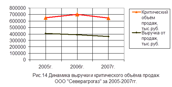 Из таблицы видно, что удельный вес фактически изготовленной продукции в первой декаде составил 328,22 %, что меньше планового показателя на 0,04 %. Во второй декаде фактический удельный вес составил 41,08 %, что больше показателя по плану на 0,48 %, а в третьей декаде фактический удельный вес составил 30,7 %, что меньше плана на 0,44%. Выполнение плана по первой, второй и третье декаде соответственно составили 1,03 %, 1,05 % и 1,02 %. К ритм = 28,22+40,6+30,7 = 99,52 К вар = (√(46,9-54)2 +(68,3-54)2 +(541,1-54)2 ) /3) / 54 = 0,100 Выпуск продукции по декадам в среднем отклоняется от графика на 10%. Далее нужно уделить внимание коэффициенту аритмичности. Он рассчитывается как сумма положительных и отрицательных отклонений в выпуске продукции от плана за каждый день (неделю, декаду). Чем менее ритмично работает предприятие, тем выше показатель аритмичности. К арит. = 0,031+0,045+0,017=0,093 Предприятие работает ритмично. 3.4 Анализ критического объёма продаж и ресурсоёмкости продукции Анализ критического объёма продаж позволяет оценить степень коммерческой надёжности организации, т.е. её устойчивость к снижению спроса и соответственно объёма продаж [17,с.217]. Выполнить анализ по данным бухгалтерской отчётности достаточно сложно в связи с тем, что по отчётности практически невозможно разделить расходы организации на постоянные и переменные. Для данной организации к переменным расходам были отнесены материальные расходы в полном объёме, а также 50% расходов на оплату труда и 50% отчислений на социальные нужды. Результаты расчётов представлены в таблице 12 и на графиках (рис. 13, 14). Таблица 12 Анализ критического объёма продаж продукции ООО «Северагрогаз» за 2005-2007 годы