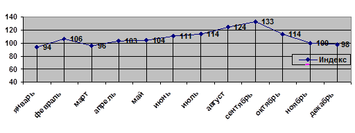 Рисунок 2.5-Среднесуточный объем перевозок по годам , в тн. Yo=(1435*31)+(1617*28)+(1458*31)+(1576*30)+(1586*31)+(1685*30)+(1742*31)+(1896*31)+(2025*30)+(1741*31)+(1528*30)+(1492*31)} / 365 = =(44485+45276+45198+47280+49166+5055+54002+58776+60750+53971+ +45840+46252) / 365 = 556051 / 365 = 1523 Таблица 2.8- Значения индексов сезонности