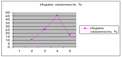 Оборот 1 квартала составлял в среднем 10,6% от среднеквартального оборота, то есть был меньше среднеквартального на 89,4%. Оборот 2 квартала составлял в среднем 26,2% от среднеквартального оборота, то есть был меньше среднеквартального на 73,8%. Оборот 3 квартала составлял в среднем 45,6% от среднеквартального оборота, то есть был меньше среднеквартального на 54,4%. В 4 квартале индекс сезонности составлял в среднем 17,6% от среднеквартального, то есть был меньше среднеквартального на 82,4%. Для наглядного изображения сезонной волны строится линейная диаграмма.