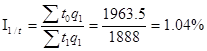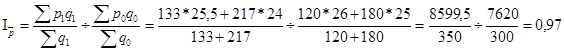 Значит, затраты труда в отчетном периоде по сравнению с базисным снизились в среднем на 3,85%. Общий индекс производительности труда вычислим по формуле: