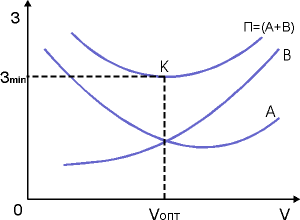 3i = С i + ЕН К i + Зтр i min где Сi — себестоимость продукции по i-му варианту; ЕН — нормативный коэффициент эффективности капитальных вложений; Кi — капитальные вложения по i-му варианту; Зтрi — транспортные расходы по i-му варианту. Оптимальным считается такой размер предприятия, при котором достигается минимум приведенных затрат. В отечественной литературе известен и графический метод определения оптимального размера предприятия, суть которого показана на рис.27.
