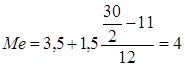 Итак, модальным значением доходов бюджета регионов являются доходы, равные 3,875 млн. руб. Медиана Ме − это вариант, который находится в середине вариационного ряда. Чтобы найти медиану необходимо отыскать значение признака, которое находится в середине упорядоченного ряда. Медианным является интервал, в котором сумма накопленных частностей превысит половину общего числа наблюдений, т.е. 15. Значение медианы вычисляется по формуле: