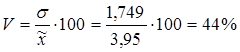 Среднеквадратическое отклонение показывает, что значение признака в совокупности отклоняется от средней величины в ту или иную сторону в среднем на 1,772 млн. руб. Для сравнения размеров вариации различных признаков, а также для сравнения степени вариации одноименных признаков в нескольких совокупностях исчисляется коэффициент вариации (V), который представляет собой процентное отношение среднего квадратического отклонения и средней арифметической: