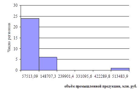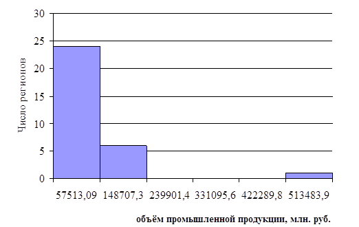 Рис. 2.3 Гистограмма распределения регионов по объёму промышленной продукции, млн. руб.