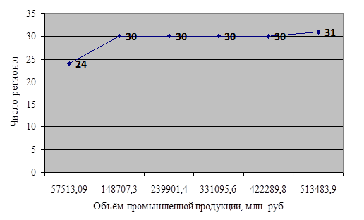 Рис. 2.4 Кумулятивное распределение регионов по объёму промышленной продукции, млн. руб. 2.2 Анализ рядов распределения