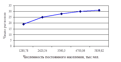 Таблица 1.2 Группировка регионов по численности постоянного населения на конец года, тыс. чел.