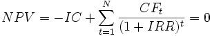 где i — ставка дисконтирования; IC = − CF 0 – размер начальной инвестиции; CFt — платёж через t лет (t = 1,...,N ) Если NPV <0, то проект отклоняется. При сравнении нескольких проектовв принимается проект с наибольшим положительным значением NPV.[2] Внутренняя норма доходности — это процентная ставка, при которой чистый дисконтированный доход (NPV) равен 0. NPV рассчитывается на основании потока платежей, дисконтированного к сегодняшнему дню. Иначе говоря, для потока платежей CF , где CFt — платёж через t лет (t = 1,...,N ) и начальной инвестиции в размере IC = − CF 0 внутренняя норма доходности IRR рассчитывается из уравнения: