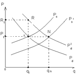 Цена предложения – это минимальная цена, за которую производитель еще готовы продать свой товар. Рs – кривая предложения. Точка Т отражает совпадение интересов производителей и потребителей. Равновесная цена – это такая цена, кот. уравнивает спрос и предложение. Механизм рынка действует след. образом: допустим, спрос на товар увеличился. Желание потребителей приобрести дополнительное количество данного товара (qn, qt) отражает новая кривая спроса . Однако, рынок может поставить товаров лишь в объеме qt. Возникает товарный дефицит. Возникает давление на рынок со стороны дополнительного спроса. Цена движется от Рt к Rt . Производители в этом случае будут увеличивать объемы продаж. Поведение производителей будет описываться новой кривой предложения . Положение на рынке вновь изменится, но в другую сторону. Предложение подтягивается к спросу и цена начнет снижаться к новой отметке равновесия N.