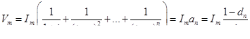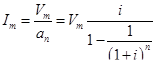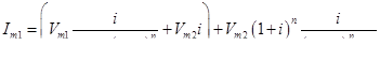 откуда следует, что с учетом риска невозврата части кредита планируемая сумма долга должна составить величину Dnc = С0 (1+ irf ) n /(1- δ)≈С0 (1+ irf ) n (1+ δ)≈ С0 (1+ irf ) n (1+ η) n ≈ C 0 (1+ irf + η+η irf ) n , (2.14) т.е. ставка процента с учетом риска невозврата кредита, характеризуемого ежегодным недополучением доли η ≈δ/ n от суммы долгов заемщиков по кредитам общей продолжительностью n периодов, равна i ≈ irf + η+η irf ≈ irf + η+ o (η, irf ) ≈ irf + η , (2.15) где o (η, irf ) - величина более высокого порядка малости, чем irf и η . Выражение (2.15), в котором величина η называется премией за риск невозврата части кредитов, легко трансформируется для случая проявления нескольких источников риска со своими количественными характеристиками и дополнительными слагаемыми - премиями за соответствующие виды риска μ, φ и другими - в выражение для ставки процента i : i = irf + η+μ+φ. (2.16) Расчет платежей по обслуживанию долгаПолучив представление о ставке процента, рассмотрим алгоритм расчета размеров платежей по обслуживанию долга как функцию величины номинальной ставки процента i , размера кредита Vm и продолжительности (числа периодов k ) кредитного соглашения для различных форм кредитования. В наиболее распространенном варианте самоамортизирующегося кредита с постоянной ставкой процента предусматриваются равновеликие платежи по обслуживанию долга, выплачиваемые в конце каждого периода с погашением основной суммы кредита и процентов. Если платежи по обслуживанию долга размером Vm вносятся один раз в год суммами Im в течение n лет, то расчет размера этих сумм можно выполнить, воспользовавшись следующей моделью. Полагаем, что ссуда условно делится на n неравных частей, возвращаемых со своими процентами в составе платежей Im в соответствующем году. Так, первая часть этой ссуды V 1 возвращается с процентами в конце первого года: Im = V 1 (1+ i ), откуда V 1 = Im /(1+ i )= Im d 1 . Вторая часть ссуды V 2 возвращается с процентами в конце второго года: Im = V 2 (1+ i )2 , что дает V 2 = Im /(1+ i )2 = Im d 2 . Наконец, n -я часть ссуды компенсируется с процентами в конце n - го года: Im = Vn (1+ i ) n и Vn = Im /(1+ i ) n = Im dn . Поскольку по условию Vm =V 1 + V 2 +...+ Vn , то из представленного выше следует:
