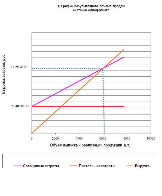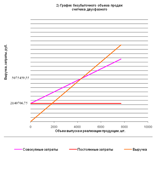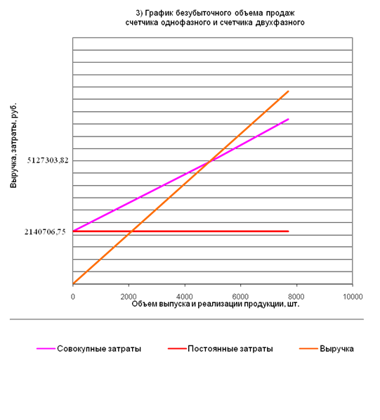 2.6 Расчет показателей эффективности использования основного и оборотного капитала. Анализ безубыточности Показателями эффективности использования основных фондов являются: 1) Рентабельность ОПФ (Rопф): Rопф = (Ппр./Фопф)*100%, где Ппр – прибыль от производства и реализации продукции, руб.; Фопф – среднегодовая стоимость ОПФ (в нашем случае – первоначальная стоимость ОПФ), руб. Рассчитаем рентабельность ОПФ: Rопф = (1 968 412,35 /29 725 701,5)*100% = 6,62%. 2) Фондоотдача ОПФ (Фо): Фо = РП/Фопф, где РП – объем реализуемой продукции за год, руб. Рассчитаем фондоотдачу ОПФ: Фо = 11 613 625,95 /29 725 701,5 = 0,39 руб. 3) Фондоемкость (Фе): Фе = Фопф/РП. Рассчитаем фондоемкость: Фе = 29 725 701,5/11 613 625,95 = 2,56 руб. Показателями эффективности использования оборотных средств являются: 1) Коэффициент оборачиваемости (Ко, количество оборотов): Ко = РП/Оссг, где Оссг – среднегодовая стоимость оборотных средств, руб. (расчетный норматив оборотных средств). Найден данный коэффициент: Ко = 11 613 625,95/334 649,95 = 34,70 2) Длительность одного оборота (П, дни): П = Т/Ко = (Т* Оссг)/РП, где Т – количество дней в расчетном периоде (360 дней). Определим длительность одного оборота: П = (360*335 390,82)/11 620 101,65 = 10 дней. 3) Коэффициент загрузки оборотных средств: КЗ = Оссг/РП. Рассчитаем этот коэффициент: КЗ = 334 679,95/11 613 625,95 = 0,028. Для расчета оптимального объема выпуска продукции, а также уровня рентабельности продукции предприятия можно использовать график безубыточности, определяющий точку безубыточности. Данная точка на графике определяет тот объем производства изделий, при котором предприятие полностью покрывает расходы на производство и реализацию продукции, т.е. прибыль равна нулю. Точка безубыточности на графике рассчитывается на основе соотношения между постоянными и переменными затратами, при этом переменные затраты принимаются из расчета на единицу продукции, а постоянные – на весь объем выпуска. В состав переменных затрат включаются расходы на сырье и материалы (Рм), комплектующие изделия и полуфабрикаты (Рк), основную заработную плату рабочих (Зос.), дополнительную зарплату рабочих (Здоп.), отчисления на социальные нужды (Рсоц.). Обозначим переменные затраты через Зпер. уд.: Зпер. уд. = Рм + Рк + Зос .+ Здоп. + Рсоц.. Расчитаем данные затраты: Счетчик однофазный: Зпер. уд.1= 62 + 110 + 228,04 + 41,43 + 64,63 = 506,1 руб. Счетчик двухфазный: Зпер. уд.2= 75 + 127 + 312,87 + 62,29 + 97,17 = 677,33 руб. В состав постоянных расходов (Зпост.) включаются все косвенные расходы в расчете на год: Зпост. = (Спол. - Зпер. уд.)*Nг.. Определим постоянные затраты: Счетчик однофазный: Зпост.1= (690,04 – 506,1)*5700 = 1 048 458 руб. Счетчик двухфазный: Зпост.1= (937,08 – 677,33)*4205 = 1 092 248,75 руб. Отсюда Зпост. общие = 1 048 458 + 1 092 248,75 = 2 140 706,75 руб. Точка безубыточности (Тб) в натуральном выражении определяется по формуле: Тб = Зпост./Ц - Зпер. уд., где Ц – цена единицы продукции. Точку безубыточности в стоимостном выражении можно определить по следующей формуле: Тб = Зпост./1 - Зпер. уд./Ц. Рассчитаем точку безубыточности в натуральном и стоимостном выражениях для всех трех случаев: 1) При производстве только счетчика однофазного: Тбнат.1= 2 140 706,75/(862,55 – 506,1) = 6006 штук. Тбст.1= 2 140 706,75/(1 – 506,1/862,55) = 5 179 546,94 руб. 2) При производстве только счетчика двухфазного: Тбнат.2= 2 140 706,75/(1171,35 – 677,33) = 4333 штук. Тбст.2= 2 140 706,75/(1 – 677,33/1171,35) = 5 075 739,55 руб. 3) При одновременном производстве обоих счетчиков: Цсредневзвешанная = (862,55*5700+1171,35*4205)/9905 = 993,65 руб. Зпер.уд. средне