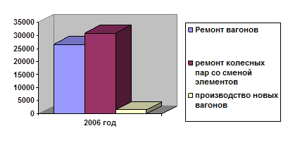 Вывод в 2006 году наибольший доход составил ремонт колесных пар со сменой элементов. Что свидетельствует о направленности деятельности завода в 2006 году на сегмент – ремонт колесных пар. Согласно экономическим показателям за 2007 год. Выручка за продукцию и услуги всего 80 452 м.руб. – 100 % - Ремонт вагонов: 31 963 м.руб. – 39,8 %. - Ремонт колесных пар со сменой элементов: 25 627 м.руб. – 31,8 %. - Производство новых вагонов: 22 862 м.руб. – 28,4 %.