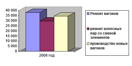 Вывод в 2007 году наибольший доход составил ремонт вагонов. Что свидетельствует о направленности деятельности завода в 2007 году на сегмент – ремонт вагонов. А так же за счет изменения ассортиментной политики завода (внедрения производства новых вагонов) значительно увеличился объем выручки в 2007 году на 21 439 м.р. Согласно прогнозируемым показателям на 2008 год. Выручка за продукцию и услуги всего 102 006 м.руб. – 100 % - Ремонт вагонов: 37 948 м.руб. – 37,2 %. - Ремонт колесных пар со сменой элементов: 29 677 м.руб. – 29,1 %. - Производство новых вагонов: 34 381 м.руб. – 33,7 %.