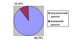 Вывод в 2008 году наибольшую выручку составит ремонт вагонов. Что свидетельствует о направленности деятельности завода в 2008 году на сегмент – ремонт вагонов. Стоит отметить, что согласно ранее приведенных показателей за три года, деятельность предприятия направлена на сегмент – ремонт вагонов. Но анализируя изменения показателей сегментов продукции и услуг, можно сделать вывод, что в дальнейшем на первое место выйдет сегмент - производство новых вагонов. 2) Сегментация по заказчикам (рынкам) Рассмотрим сегментацию продукции и услуг УП «Минский вагоноремонтный завод» на внутреннем и внешнем рынках. Согласно экономическим показателям за 2006 год. Объем реализации продукции всего – 60 027 м.руб – 100 %. - внутренний рынок 54 238 м.руб – 90,35 %. - внешний рынок 5 789 м.руб – 9,65 %.