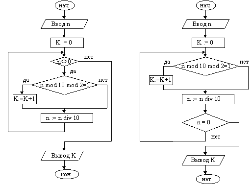 Рассмотренный пример иллюстрирует неполную развилку. Также следует отметить, здесь логическое выражение, являющееся условием, содержит 2 операнда. Циклы Если какие-либо операторы необходимо выполнить несколько раз, то их не переписывают каждый раз заново, а организуют цикл. Пример 1. Подсчитать количество нечетных цифр в записи натурального числа n. Идея решения. Из заданного числа выбирать из младшего разряда цифру за цифрой до тех пор, пока оно не исчерпается, т.е. станет равным нулю. Каждую нечётную цифру учитывать.