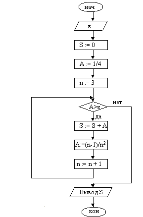 Вычислить при n>2 сумму тех ее членов, которые больше заданного числа e. При решении задачи находится очередной член последовательно и, если он больше e, добавляется к сумме.