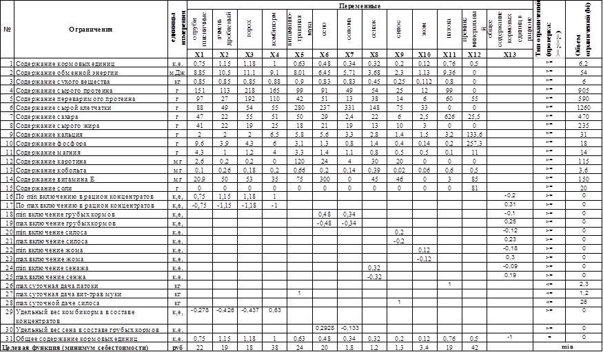 3 Построение экономико-математической модели За основные неизвестные в данной задаче принимается количество кормов и кормовых добавок, включаемых в суточный рацион, X1 - отруби пшеничные X2 - ячмень дробленый Х3 - горох X4 - комбикорм X5 - витаминно-травяная мука X6 - сено X7 - солома X8 - сенаж X9 - силос кукурузный X10 - жом X11 - патока X12 - премикс минерально-витаминный Вспомогательная переменная X13 выражает общее содержание кормовых единиц в рационе, За единицу измерения основных переменных величин принят физический вес корма в килограммах (кг). На переменные накладываются следующие группы ограничений: · по содержанию питательных веществ в рационе; · по пределам включения отдельных групп кормов в рацион; · по соотношению отдельных видов кормов и добавок; · по суммарному количеству кормовых единиц в рационе. Основными ограничениями (1-15) являются условия по балансированию питательных веществ в рационе. Технико-экономическими коэффициентами при основных переменных Xj в этих ограничениях являются показатели содержания питательных веществ в единице каждого вида корма (Таблица 1), а в правой части неравенств записывается потребное количество каждого вида питательных веществ для животных, необходимое для получения определенной продуктивности - B i (Таблица 2). Например, ограничение, требующее наличия в рационе 5,3 кормовых единиц, будет записано в следующем виде: 0,75x1+1,15x2+…….+0,76x11+0,5x12>=6,2 (1) Ограничение по содержанию обменной энергии в рационе 8,85x1+10,5x2+……,+9,36x11>=54(2) Ограничение по содержанию сухого вещества в рационе 0,85x1+0,85x2……+0,8x11>=6(3) Ограничение по содержанию сырого протеина в рационе 151x1+113x2+…,,+99x11>=905(4) Ограничение по содержанию переваримого протеина в рационе 97x1+27x2+……+60x11+ 55x12>=590(5) Ограничение по содержанию сырой клетчатки в рационе 88x1+49x2+……+33x10>=1260(6) Ограничение по содержанию сахара в рационе 47x1+22x2+……+626x11+25,5x12>=470(7) Ограничение по содержанию сырого жира в рационе 41x1+22x2+……+3x10>=235(8) Ограничение по содержанию кальция в рационе 2x1+2x2+……+3,2x11+133,6x12>=31(9) Ограничение по содержанию фосфора в рационе 9,6x1+3,9x2+……+0,2x11+257,3x12>=18(10) Ограничение по содержанию магния в рационе 4,3x1+1x2+……+0,1x11+27x12>=14(11) Ограничение по содержанию каротина в рационе 2,6x1+0,2x2+……+20x9>=115(12) Ограничение по содержанию кобальта в рационе 0,1x1+0,26x2+……+0,06x10+0,6x11+0,5x12>=3,6(13) Ограничение по содержанию витамина Е в рационе 20,9x1+50x2+……+3x11>=150(14) Ограничение по содержанию соли в рационе 81x12>=20(15) Дополнительные ограничения (16-25) по пределам скармливания отдельных видов кормов или групп кормов. Условие по минимальному и максимальному удельному весу концентратов в рационе имеет вид: минимальная граница (границы выбираются из таблицы 3 и делятся на 100 и записываются в виде коэффициента при х13) (при x4 – коэффициент 1, в данной записи его не пишут), (не менее 20%/100=0,2 ) 0,75x1+1,15x2+1,18x3+x4>=0,2 x13; максимальная граница (не более 31 %/100=0,31 ) 0,75x1+1,15x2+1,18x3+x4<=0,31 x13, Исходя из этого, преобразуя неравенство (перенесем х13 за знак неравенства), получим следующую запись данных ограничений: 0,75x1+1,15x2+1,18x3+x4-0,2 x13>=0 ;(16) 0,75x1+1,15x2+1,18x3+x4-0,31 x13<=0, для приведения неравенства к типу «>=», преобразуем его в следующий вид -0,75x1-1,15x2-1,18x3-x4+0,31 x13>=0(17) Ограничение по минимальному и максимальному включению в рацион грубых кормов: 0,48x6+0,34x7-0, 1 0 x13>=0(18) -0,48x6-0,34x7+0,25 x13>=0(19) Ограничение по минимальному и максимальному включению в рацион силоса: 0,2x9-0, 1 2 x13>=0(20) -0,2x9+0,23 x13>=0(21) Ограничение по минималь