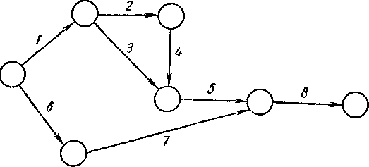Рис 1.3 Заметим, что если обозначить каждую работу кружком и соединить стрелками, как это показано на рис. 1.3, каждую работу с теми, которым она непосредственно предшествует, то мы получим некоторое геометрическое изображение очередности выполнения работ. Такие стрелочные диаграммы, составленные из кружков — вершин, и стрелочек — ориентированных дуг, в математике принято называть графами. Диаграмму, подобную изображенной на рис. 1.3, договоримся называть графом технологического маршрута.