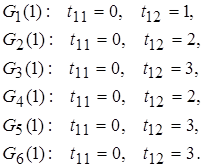 Иными словами, первая операция детали d 1 обрабатывается на первом рабочем месте R 1 вторая операция детали d 1 и первая операция детали d 2 обрабатываются на R 2 , вторая операция d 2 обрабатывается на R 3 . Данциг рассматривал по шесть (возможных) изолированно построенных вариантов обработок первой и второй детали, ориентируясь на работу в четыре последовательных периода, каждый из которых равен единице времени. В этом случае первая деталь может обрабатываться одним из следующих способов: