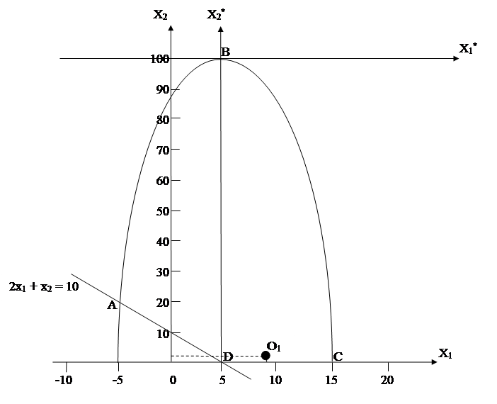 Z” x1x1 Z” x1x2 = -0.4 0 Z” x2x1 Z” x2x2 0 -0.4 Определим знаки главных миноров данной матрицы. Главный минор первого порядка -0.4 < 0. Главный минор второго порядка 0.16 > 0. Т.к. знаки миноров чередуются, функция Z - строго вогнута. Экстремум вогнутых функций – max, следовательно в точке О у целевой функции находится абсолютный максимум. Для построения области допустимых значений преобразуем второе неравенство системы ограничений: x1 2 – 10x1 + x2 ≤ 75 x1 2 – 10x1 + 25 + x2 ≤ 100 (x1 – 5)2 + x2 ≤ 100 (x1 – 5)2 ≤ 100 – x2 Уравнение (x1 – 5)2 = 100 – x2 выразим через переменные x1 * и x2 * :