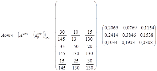 В соответствии с формулой (2) объем валового выпуска первой отрасли в отчетном периоде определяется суммой промежуточных затрат и валовой добавленной стоимости. Поскольку валовой выпуск отраслей уже найден (xi отч ), а промежуточные затраты легко определить на основе данных о n межотраслевых потоках (Σ xij , j = 1,3) , находим валовую добавленную i =1 стоимость первой отрасли: ۷ 1 = х1 отч – ( х11 отч + х21 отч +х31 отч ) = 145 – (30+35+15) = 65, аналогично для второй и третьей отрасли: ۷ 2 = 130 – (10 + 50 + 25 ) = 45, ۷ 3 = 130 – ( 15 + 20 + 30 ) = 65. Учитывая, что 30% валовой добавленной стоимости приходится на зарплату, рассчитываем уровень зарплаты отраслей (zi ): z1 = 30% * ۷ 1 = 0,3 * 65 = 19,5, z2 = 0,3 * 45 = 13,5, z3 = 0,3 * 65 = 19,5; и как балансирующий элемент – прочие элементы добавленной стоимости (di ): d1 = ۷ 1 - z1 = 65-19,5 = 45,5, d2 = 45 – 13,5 = 31,5, d3 = 65 – 19,5 = 45,5. 1.2. Матрица коэффициентов прямых затрат ( аij ) n * n рассчитывается на основе отчетного МОБ по формуле: ___ ___ аij отч = Х ij отч , i = 1,n , j = 1,n (3) хj отч Для нашей задачи в соответствии с соотношением (3), получаем: а11 отч = Х11 отч = 30_ = 0,2069, х1 отч 145 а12 отч = Х12 отч = 10_ = 0,0769, х2 отч 130 и т.д. Вычисления оформляются в виде матрицы прямых затрат
