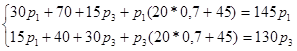 Поскольку индекс цен на продукцию второй отрасли равен 2 и величина затрат на продукцию второй отрасли не влияет на формирование цены в этой отрасли, то баланс описывается для первой и третьей отрасли. Модель строится с использованием балансовых соотношений (2) в новых ценах: