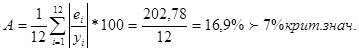 Данное значение коэффициента корреляции позволяет сделать вывод о том, что связи между прибылью и ставкой налога не чуществует. Средняя относительная ошибка аппроксимации для нашего примера рассчитывается как среднеарифметическая относительных отклонений по каждому наблюдению: