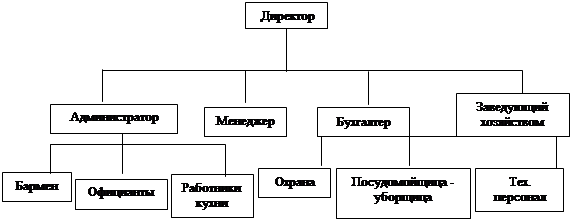 Рис.1. Линейно - функциональная ОСУ управления на предприятии. Организационная структура управления имеет ряд положительных сторон: - эффективна в стабильное среде; - позволяет экономить на управленческих расходах; - имеет значительную специализацию и компетентность; - ориентированна на стабильную технологию и сложившийся рынок; - ориентированна на ценовую конкуренцию. Организационная структура управления на предприятии показывает и характеризует взаимоотношения. Исполнительный директор (являющийся учредителем) имеет обязанностью - квалифицированное руководство кафе-баром в соответствии с действующем законодательством и нормативными правовыми актами по организации работы. Он обязан вести управленческую деятельность, оценивать возможные пути развития, последствия тех или иных решений. Не реже одного раза в месяц руководитель должен анализировать среднюю нагрузку в час всех работников, разрабатывая на основе этого анализа мероприятия по обеспечению равномерности нагрузки. Вести приём посетителей по вопросам качества работы и квалификации персонала. Оценка работы руководителя проводится методом самооценки по итогам работы. Руководитель несёт ответственность за некачественную работу, ошибочные действия не только в своей деятельности, но и в деятельности кадров, за неправильно принятые решения вопросов, входящих в компетенцию руководителя. Менеджер (являющийся учредителем) – призван анализировать факторы внешней среды: покупателей, поставщиков, конкурентов; организовывать маркетинговые исследования, рекламу и сбыт продукции; является консультантом директора в вопросах выбора пути развития и управленческих решений. Обязательно наличие высшего экономического образования, опыт работы в сфере управления, не конфликтность, энергичность, ответственность. Директор и менеджер должны осуществлять подбор и расстановку кадров; проводить оценку персонала; разрабатывать систему моральных и материальных поощрений и наложения дисциплинарных взысканий на персонал. Контролировать и лично проводить систематические проверки качества работы; проводить по итогам года анализ показателей деятельности кафе-бара; организовывать повышение квалификации персонала с привлечением различных специалистов, путём проведения конференций, лекций и докладов на базе этого кафе-бара и в других учреждениях, работающих в этом направлении. Бухгалтер. Основные требования при подборе: высшее экономическое образование, умение работать с компьютером, опыт работы по специальности не менее 3-х лет. Бухгалтерия осуществляет все расчёты с поставщиками продукции, ведёт учёт по товарообороту, прибыли, издержкам, организовывает и документально оформляет начисление заработка, и составляет отчёты. Составляет отчётные калькуляции себестоимости продукции, выявляет источники образования потерь и расходов, подготавливает предложения по их предупреждению. Проводит экономический анализ хозяйственно финансовой деятельности предприятия по данным бухгалтерского учёта и отчётности в целях выявления режима экономии мероприятий по совершенствованию документооборота. Несёт материальную и административную ответственность за достоверность данных статистического и бухгалтерского учётов. Администратор – работает в основном с клиентами (встр