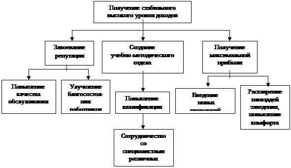 Рис.4. Дерево целей организации. Миссия кафе-бара заключается в удовлетворение потребности людей в качественном питании по доступным ценам. Играет все большую роль в организации достойного досуга для значительной части жителей и гостей города. В совокупность планов деятельности предприятия входят: план продажи, складской план, план производства, план НИОКР, план доходов, финансовый, по персоналу, закупок инвестиций, расходов, кредитный и др. Определяющим параметром деятельности предприятия оказывается продажа продукции. Она реализуется главным образом на основе спроса, который может выравниваться по интервалам времени. Рассмотрим несколько этапов заключающих в себе вопросы планирования. Изучение рынка - исключительно большое значение. Подготовка к производству начинается когда спрос на данный товар действительно существует. Система управления, при которой в основу принятия решений о начале производства продукции положена информация о рынке, называется маркетингом. Предприятие планирует свое развитие исходя из потребностей и желаний потенциальных покупателей. Цена продажи товара калькулируется на основе изучения рынка, и только после этого должен решаться вопрос о том, может ли производство данного изделия обеспечить получение необходимого уровня прибыли.