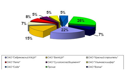 Рис. 9. Доли предприятий в производстве асбестоцементных листов Наибольшей долей рынка владеют ОАО «Себряковский КАЦИ», ОАО «Белгородасбестоцемент», ОАО «ЛАТО». ОАО «Комбинат Красный Строитель» уступает основным конкурентам в объемах производства шифера в 2 раза (ОАО «Себряковский КАЦИ», ОАО «Белгородасбестоцемент»,). Продукция ОАО «Комбинат Красный Строитель» представлена как на внутреннем рынке, так и зарубежом. Российский рынок обширен. Рынок строительных материалов имеет достаточно выраженный сезонный характер, что определяет нагрузку по организации сбытовой деятельности, которая носит пиковый характер в летний период. В 2007 г. было произведено 2 026,2 млн. усл. плит шифера, в 2006 г. – 1 937,6 млн. усл. плит. Расчет рыночных показателей по шиферу затруднен переводом условных плиток, в которых традиционно измеряется шифер, в квадратные метры, в которых измеряется большая часть кровельных материалов. Таможенная статистика приводит, в свою очередь, данные в килограммах. Поэтому нижеприведенные оценки не исключают некоторых погрешностей. Воспользуемся тем, что физический смысл условного шиферного листа – это пластина размером 1 750 х 1 130 мм и толщиной 5,8 мм. Средняя масса 1 кв. м товарного шифера составляет около 13 кг, а средняя толщина-8–10 мм (от 6 до 20 мм). По статистическим данным, производство шифера в 2007 г. увеличилось на 4,55% и составило 2 026, 2 млн. усл. плит. Экспорт шифера из России идет в основном на рынки Азербайджана, Казахстана и Молдавии, а импортные поставки (преимущественно из Кореи, Китая и Малайзии) в связи с малыми объемами существенного влияния на состояние внутреннего рынка не оказывает. Производство асбестоцементных кровельных листов (шифера) сократилось в России в 2008 году, по сравнению с 2007 годом, более чем на 3% – до 1,8 миллиарда условных плит. Сокращение производства шифера связано с активным распространением в России конкурирующих кровельных материалов – черепицы, металлочерепицы, рубероида и кровельного железа. К тому же в 2008–2009 гг. на падение производства шифера в РФ также оказал влияние такой фактор, как проявление в России последствий мирового финансового кризиса. Напрямую кризис вряд ли окажет влияние на производство шифера. Однако некоторое влияние может быть в результате психологического фактора, так как сегодня люди меньше стали тратить деньги и не делают крупных приобретений. В дальнейшем прогнозируется постепенное снижение производства шифера на фоне роста потребления более современных кровельных материалов. Есть и другие оценки. По мнению экспертов «Инфомайн», объем производства асбестоцементных листов к 2010 г. увеличится на 30% (по отношению к 2005 г.) и составит 2 560 млн. условных плиток. При этом прирост производимой продукции будет осуществляться как за счет роста экспорта этой продукции в страны СНГ, так и за счет внутреннего потребления. 2.3 Технико-экономический и финансовый анализ ОАО «Комбинат Красный Строитель»Наличие и движение основных фондов Важнейшим показателем производственной структуры ОПФ является доля активной части в их общей стоимости. Это связано с тем, что объем выпуска продукции, производственная мощность и другие экономические показатели работы предприятия в значительной мере зависят от величины активной части ОПФ. Поэтому повышение ее доли до оптимального уровня является