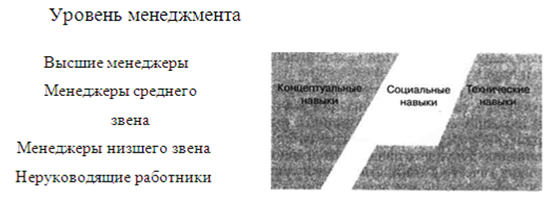 | Модель современного менеджера Работа руководителя сложна и содержит множество характеристик. Теоретики менеджмента составляют длинные списки необходимых менеджеру навыков, однако все их можно разделить на три основные группы: концептуальные, социальные (гуманитарные, в области человековедения) и технические. Как показано на рис. соотношение основных типов навыков меняется по мере восхождения человека по служебной лестнице. Хотя пропорции варьируются в зависимости от уровня управления, основными навыками должны в совершенстве владеть все без исключения менеджеры.