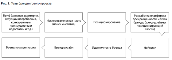 В процессе реализации бизнес-стратегии компания, как правило, создает бренд или несколько брендов. Будем называть процесс создания такого бренда и достижения им планируемой рыночной позиции брендинговым проектом, в котором можно выделить несколько фаз (рис. 3).