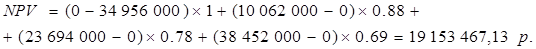 Следовательно, срок окупаемости инвестиций РР =2,22 г. Расчет чистой текущей стоимости. Чистая текущая стоимость или чистый дисконтированный доход (NPV ) представляет собой разность дисконтированных на один момент времени (обычно на год начала реализации проекта) показателей дохода и инвестиционных расходов. Расчет производится по формуле