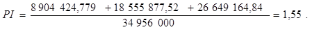 Рис. 3. Зависимость чистого дисконтированного дохода от нормы дисконта Согласно UNIDO внутренняя норма рентабельности инвестиций характеризует устойчивость проекта относительно ставки дисконта. Проект считается успешным, если внутренняя норма рентабельности больше ставки дисконта на 10%. В нашем случае IRR=d+23%, что говорит об эффективности и прибыльности проекта. Индекс доходности инвестиций (PI) – отношение приведенной (текущей) стоимости будущих денежных потоков от реализации инвестиционного проекта к приведенной (текущей) стоимости первоначальных инвестиций: