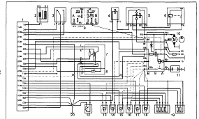 Рис. Функциональная схема управления системой впрыска "L-Jetronic": А — устройство входных параметров: 1 — датчик температуры всасываемого воздуха, 2 — расходомер воздуха, 3 — выключатель положения дроссельной заслонки, 4 — высотный корректор, 5 — датчик-распределитель зажигания, б — датчик температуры охлаждающей жидкости, 7 — термореле. В — устройства управления и обеспечения: 8 — электронный блок управления, 9 — блок реле, 10 — топливный насос, 11 — аккумуляторная батарея, 12 — выключатель зажигания. С — устройства выходных параметров: 13 — рабочие форсунки, 14 — клапан добавочного воздуха, 15 — пусковая форсунка Клапан дополнительной подачи воздуха 19, (см. рис. 35), установленный в воздушном канале, выполненном параллельно дроссельной заслонке, подводит к двигателю добавочный воздух при холодном пуске и прогреве двигателя, что приводит к увеличению частоты вращения коленчатого вала. Для ускорения прогрева используются повышенные обороты холостого хода (более 1000 об/мин). Для облегчения пуска холодного двигателя, также как и в других рассмотренных системах впрыска, здесь применяется электромагнитная пусковая форсунка 6, продолжительность открытия которой изменяется в зависимости от температуры охлаждающей жидкости (термореле 17). Функциональную связь всех элементов системы впрыска "L-Jetronic" можно увидеть обратившись к рис. 36. Величина необходимой в настоящий момент дозы топлива вычисляется электронным блоком управления в зависимости от массы всасываемого воздуха (объем, давление, температура), температуры двигателя и режима его работы. ФУНКЦИОНИРОВАНИЕ СИСТЕМЫ ПРИ РАЗЛИЧНЫХ РЕЖИМАХ РАБОТЫ ДВИГАТЕЛЯ Каждый цилиндр имеет свою форсунку с электромагнитным управлением, впрыскивающую топливо перед впускным клапаном. Впрыск согласован с частотой вращения коленчатого вала двигателя. Информация о частоте вращения передается в электронный блок управления от контакта прерывателя (системы зажигания с контактным управлением), от клеммы "1" катушки зажигания или клеммы "16" коммутатора (для бесконтактных систем зажигания). Объем проходящего воздуха полностью определяется положением дроссельной заслонки (нагрузкой двигателя). Объем (масса) воздуха измеряется расходомером. Последним не учитывается только воздух, проходящий через обводной канал, который используется для СО-регулирования, (см. рис. 35). О тепловом режиме двигателя дает информацию датчик температуры охлаждающей жидкости. Информацию о нагрузочном режиме двигателя в блок электронного управления сообщает выключатель положения дроссельной заслонки. Информация состоит из сигналов: "холостой ход", "частичные нагрузки", "полная нагрузка". Если дроссельная заслонка закрыта, двигатель работает на холостом ходу, контакты холостого хода замкнуты и в электронный блок управления идет соответствующий сигнал. Также осуществляется информация о полной нагрузке двигателя, только в этом случае контакты разомкнуты. Сигнал о частичной нагрузке формируется при помощи потенциометра. Для облегчения холодного пуска смесь обогащается пусковой форсункой. Последняя управляется от выключателя зажигания через термореле, (см. рис. 14) через реле пуска холодного двигателя (послестартовое реле) и термореле, (см. рис. 16). Назначение послестартового реле — продлить время работы пусковой форсунки. При
