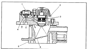 Рис. Узел Центральной форсунки: 1 — регулятор давления топлива, 2 — датчик температуры всасываемого воздуха, 3 — электромагнитная форсунка, 4 — корпус форсунки и регулятора, 5 — корпус дроссельной заслонки, 6 — дроссельная заслонка