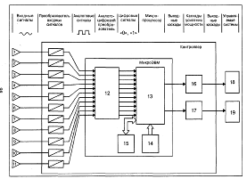 Рис. Схема системы впрыска "Mono-Jetronic": 1 — измеритель расхода воздуха, 2 — форсунка, 3 — блок электронного управления, 4 — клапан добавочного воздуха, 5 — датчик положения дроссельной заслонки (потенциометр), 6 — регулятор давления топлива в системе, 7 — топливный фильтр, 8 — топливный насос, 9 — датчик температуры охлаждающей жидкости Объединенные системы впрыска и зажигания Внедрение электроники в управление системами зажигания и питания привело к созданию объединенного или центрального электронного управления двигателем. Объединенное электронное устройство называют микроЭВМ, микропроцессор или контроллер. У нас первые системы объединенного управления появились на карбюраторных автомобилях ВАЗ-2108, -2109 и назывались МСУД (микропроцессорная система управления двигателем). Системы эти выполняют довольно скромную задачу и предназначаются только для управления зажиганием (моментом и энергией искрообразования) и электромагнитным клапаном карбюратора. Системы объединенного электронного управления впрыском (смесеобразованием) и зажиганием имеют следующие преимущества: совмещение функций агрегатов и датчиков позволяет сократить их число; процессы зажигания и смесеобразования оптимизируются совместно, при этом улучшаются характеристики крутящего момента, расхода топлива, состава отработавших газов, облегчается пуск и прогрев холодного двигателя; открываются большие возможности для выполнения других функций: управление автоматической коробкой передач, противобуксовочной системой ведущих колес, антиблокировочной тормозной системой, кондиционером, противоугонным устройством и т.п. Прежде чем перейти к рассмотрению объединенной системы электронного управления обратим внимание на функциональную структуру этой системы и названия ее составных частей, (рис. 50). В контроллер от датчиков поступают аналоговые сигналы 1—11, (см. рис. 50), (греч. аналогиа — соответствие, сходство, подобие). Или, другими словами, к контроллеру "подаются" не непосредственно температура, давление и т.д., а их электрический аналог — ток, с соответствующим образом изменяющимися параметрами (напряжение, сила). В общем случае изменение токов и напряжений происходит непрерывно по тому или иному закону, например по синусоидальному. Интегральные схемы микропроцессоров ЭВМ характеризуются тем, что они работают в импульсном режиме и могут находиться только в одном из двух состояний — согласно используемой в современных ЭВМ двоичной системе счисления (только две цифры — ноль и единица). Поэтому сигналы датчиков сначала преобразуются в "более четкие" аналоговые сигналы, которые в свою очередь в аналого-цифровом преобразователе 12, (см. рис. 50), превращаются в цифровую информацию.