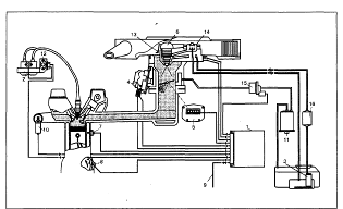 Рис. Схема системы впрыска "Mono-Jetronic": 1 — топливный бак, 2 — топливоподающий насос, 3 — топливный насос, 4 — топливный фильтр, 5 — узел центральной форсунки, 6 — регулятор холостого хода с шаговым электродвигателем, 7 — потенциометр дроссельной заслонки, 8 — лямбда-зонд, 9 — электронный блок управления впрыском, 10 — датчик температуры охлаждающей жидкости, 11 — прибор коммутирующий сигнал информации о частоте вращения коленчатого вала двигателя получаемый из системы зажигания, 12 — выключатель зажигания, 13 — аккумуляторная батарея, 14 — датчик-распределитель