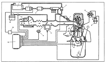 Рис. Схема цифровой системы управления двигателем "Motronic 3.1": 1 — топливный бак, 2 — топливный насос, 3 — топливный фильтр, 4 — регулятор давления топлива, 5 — катушка зажигания, 6 — измеритель массы воздуха с нагреваемым проводником, 7 — форсунка, 8 — свеча зажигания, 9 — потенциометр дроссельной заслонки, 10 — контроллер, 11 — поворотный регулятор холостого хода, 12 — датчик температуры охлаждающей жидкости, 13 — датчик детонации, 14 — датчик числа оборотов двигателя, 15 — клапан вентиляции топливного бака, 16 — адсорбер (емкость с активированным углем) Клапан работает циклично и управляется контроллером 10 в зависимости от оборотов и нагрузки двигателя (положения дроссельной заслонки). Пока клапан находится под напряжением (более 10 В), трубопровод, идущий к впускному коллектору, закрыт. При снятии напряжения с клапана он может открыться под действием разрежения во впускном коллекторе. Цикл удаления паров топлива начинается с включения в работу датчика концентрации кислорода. После каждого рабочего цикла клапан вентиляции топливного бака остается закрытым примерно в течение 30 с. При этом происходит корректировка холостого хода, если двигатель работает на холостом ходу. После остановки двигателя клапан вентиляции остается под напряжением, т.е. закрытым в течение 3 с для предотвращения самовоспламенения рабочей смеси после выключения зажигания. Затем при неработающем двигателе (клапан вентиляции обесточен) закрывается пружинный обратный клапан. Тем самым прекращается поступление паров топлива во впускной коллектор. Когда температура наружного воздуха повышена или в случае превышения нормальной температуры охлаждающей жидкости контроллер вырабатывает команды на смещение угла опережения зажигания в сторону запаздывания для предотвращения детонации. В системе "Motronic 3.1" предусмотрена защита нейтрализатора отработавших газов. Отклонения от нормальной работы первичной цепи системы зажигания обнаруживаются контроллером, который выключает форсунку неисправного цилиндра. Благодаря этому предотвращается поступление несгоревшей рабочей смеси в нейтрализатор. На двигателях с системой "Motronic 3.1", содержание СО в отработавших газах не регулируются. Винтов качества и количества в системе холостого хода нет вообще. |