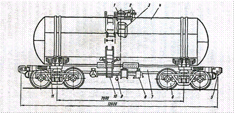Рис.1 Цистерна для перевозки бензина и светлых нефтепродуктов (модель15-1443): 1-горловина, 2-предохранительная арматура, 3-внутренняя лестница,4-котел, 5-ударнотяговые устройства, 6 - ходовая часть, 7-рама, 8-тормозноеоборудование, 9-сливной прибор, 10-наружная лестница, 11-устройства крепления котла к раме. Рама служит для восприятия тяговых усилий, ударов в автосцепку, а также инерционных сил котла, возникающих при изменении скорости движения цистерны. По типу ходовой части различают 4-х и 8-ми осные цистерны (рис.2).