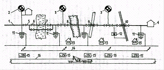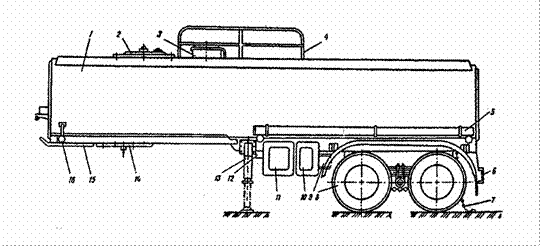 Рис.4 Полуприцеп-цистерна ППЦ-16,3: 1-корпус цистерны, 2-крышка компенсационной емкости, 3-наливная горловина, 4-поручень, 5-пенал, 6-бампер, 7-цепь заземления, 8-тележка, 9-запасное колесо, 10,11-шкафы для оборудования, 12-ящик ЗИП, 13-опорное устройство, 14-опорная плита, 15-плита наката, 16-световозращатель Она предназначена для транспортировки и кратковременного хранения светлых нефтепродуктов. Они транспортируются с помощью специальных тягачей (например, КамАЗ-5410). Специальное оборудование смонтировано на шасси полуприцепа ОдАЗ-9370 и состоит: из цистерны с горловинами, лестницей, поручнем, пеналами, ящиком запчастей и принадлежностей; технологического оборудования, расположенного в боковом шкафу и включающего в себя систему трубопроводов и запорной арматуры; электрооборудования, а также средств контроля и дистанционного управления узлами полуприцепов-цистерн. Кроме того, в состав дополнительного оборудования, размещаемого в боковом шкафу, входят фильтр тонкой очистки топлива, два счетчика жидкости, раздаточные рукава, намотанные на барабаны и раздаточные краны. Основными элементами автоцистерны для перевозки сжиженных газов являются: наружный стальной кожух, внутри которого на 6 вертикальных цепях подвешен латунный сосуд емкостью 2,6 м3 ; контрольно-измерительные приборы и запорная арматура, которые размещены на задней стенке корпуса в специальном шкафу; два испарителя, расположенные по бокам цистерны и предназначенные для создания необходимого давления с целью передавливания жидкости. Пространство между корпусом и латунным сосудом заполнено тепловой изоляцией. Достоинствами автомобильного транспорта нефтегрузов являются: 1) большая маневренность; 2) быстрота доставки; 3) возможность завоза грузов в пункты, значительно удаленные от водных путей или железной дороги; 4) всесезонность. К его недостаткам относятся: 1) ограниченная вместимость цистерн; 2) относительно высокая стоимость перевозок; 3) наличие порожних обратных пробегов автоцистерн; 4) значительный расход топлива на собственные нужды. 1.5 Трубопроводный транспортВ зависимости от вида транспортируемого продукта различают следующие типы узкоспециализированных трубопроводных систем: нефтепроводы, нефтепродуктопроводы, газопроводы и трубопроводы для транспортирования нетрадиционных грузов. Независимо от того, что транспортируется по трубам, все узкоспециализированные системы состоят из одних и тех же элементов (на примере нефтепровода (рис.5)):