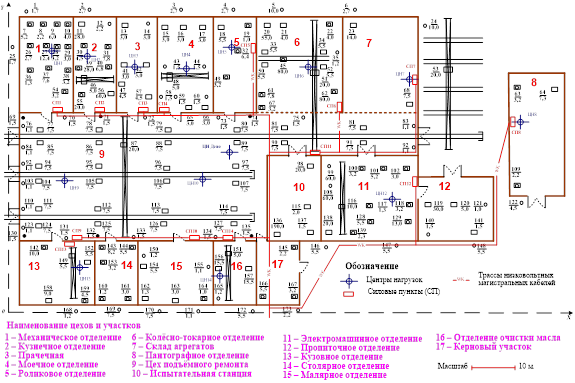 = 36,8 м. В некоторых случаях возле определённого центра нагрузок оказывается движущееся оборудование, технологический проход и т.д. в таком случае силовой пункт необходимо располагать на ближайшем удобном участке площади депо. Для выбора места расположения силового шкафа питания группы нагрузок СП-11 выберем точку с координатами ХСП-11 = 73,0 м и YСП-11 = 37,0 м возле стены здания в помещении цеха подъёмного ремонта. Центр нагрузок оказывается удалён от силового пункта СП-11 на 1,0 м. Подобным образом определим координаты других групп ЭП и распределительных шкафов депо и данные занесём в таблицу 1.3. С учётом расчётов выполненными студенткой Свиридовой Е.И. по максимальной мощности групп электроприёмников и определим координаты центра тяжести всех нагрузок депо, который оказался в точке с координатами: ХД = 50,5 м и Y Д =37,5 м. Для уменьшения потерь электроэнергии в низковольтной сети питающая подстанция должна быть максимально приближена к центру нагрузок, однако для удешевления проекта при реконструкции системы электроснабжения сохраним существующую подстанцию в отдельном кирпичном строении и расположенную на расстоянии 0,1 км от ввода низковольтных кабелей в помещения депо со стороны кернового отделения. Следовательно, место расположения ТП Депо смещено от центра нагрузок депо на 138,0 м. Таблица 1.3 – Координаты центра нагрузок и места установки силовых пунктов групп электроприёмников, в метрах