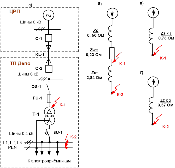 Рисунок 1.4 – Схемы для расчета сверхтока при КЗ Для выбора параметров и характеристик оборудования и уставок токовых защит необходимо определить ток КЗ в различных точках сети. Локомотивное депо получает основное питание по высоковольтной кабельной линии 6 кВ длиной 0,9 км и выполненной кабелем марки ААШВ 3×120 с сечением алюминиевых жил по 120 мм2 . Расчет тока КЗ удобнее вести в именованных единицах, так как сопротивление большей части элементов цепи собственных нужд (шин, кабелей, переходных сопротивлений) задается в каталогах в Омах. Сопротивления всех элементов схемы замещения приводятся к среднему номинальному напряжению ступени КЗ UСН , которое на 5% больше номинального /3/. Индуктивное сопротивление системы определяется из предшествующих расчетов результирующих сопротивлений всех условно объединенных источников до шин подстанции, или же вычисляется по мощность КЗ на шинах подстанции. Складываются соответствующие составляющие, определяется результирующие сопротивления цепи КЗ где r å - активное, x å - реактивное и z å - полное сопротивления, Ом Для упрощения расчёта активные сопротивления цепи учитываются, если они более чем на 10% влияют на конечный результат /3/. Следующим упрощением является то, что полные сопротивления цепи КЗ складываются арифметически, а не геометрически. При этом преимущественно активное сопротивление воздушных и кабельных линий арифметически складывается с преимущественно индуктивным сопротивлением трансформаторов. Действующее значение периодической составляющей тока трёхфазного КЗ IКЗ определится, кА