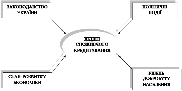 Рис. 3.2 Вплив інформаційного поля суспільства Законодавство України має безпосередній вплив на діяльність акціонерного банку. Будь-який комерційний банк підпорядкований НБУ. Отже, є відповідні закони, постанови, положення, які коригують діяльність акціонерних комерційних банків щодо встановлення відсоткових ставок, грошових коштів та залишків в НБУ, умов кредитування фізичних та юридичних осіб тощо. Політичний та економічний стан країни є невід’ємними, взаємопов’язаними поняттями, що також мають сильний вплив на роботу відділу споживчого кредитування. Політичні події безумовно задають тон в розвитку економіку, зокрема впливають на зовнішньоекономічні відносини, рівень добробуту населення. Політична нестабільність одразу ж відбивається на роботі акціонерних комерційних банків шляхом підвищення відсоткових ставок, зміни попиту на кредитні продукти банку у бік зменшення. Те саме можна сказати і про рівень добробуту населення, який в свою чергу залежить від стану розвитку економіки і рівня політичної стабільності країни. Попит населення на різноманітні кредитні продукти прямопропорційно залежить від його доходів, освіченості, фінансових можливостей. Кредит асоціюється у простого населення з певними обов’язками, тому, якщо людина не впевнена у завтрашньому дні, то і брати на себе ці зобов’язання вона не схоче, відповідно, попит на продукт зменшиться. Рівень життя українців на даному етапі розвитку економіки є досить низьким, тому спостерігається тенденція до зменшення попиту на кредити за політичної чи економічної нестабільності, а також збільшення кількості проблемних споживчих кредитів. 3.3 ПРОПОЗИЦІЇ ЩОДО ВДОСКОНАЛЕННЯ ФУНКЦІОНУВАННЯ ВІДДІЛУ СПОЖИВЧОГО КРЕДИТУВАННЯ АКБ «ПРАВЕКС-БАНК»Наші пропозиції щодо вдосконалення роботи відділу споживчого кредитування будуть торкатися наступних напрямів (рис. 3.3):